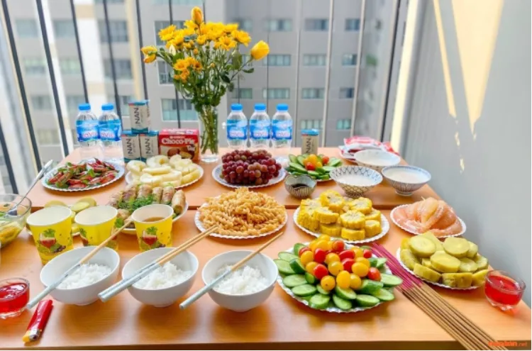 Gia chủ có thể lựa chọn mâm cỗ mặn hoặc chay tùy theo điều kiện và quan niệm. Mâm cỗ mặn thường gồm gà luộc, thịt luộc, xôi, chè… Mâm cỗ chay có thể gồm các món như đậu hũ hấp, rau củ luộc, xôi đậu, chè…